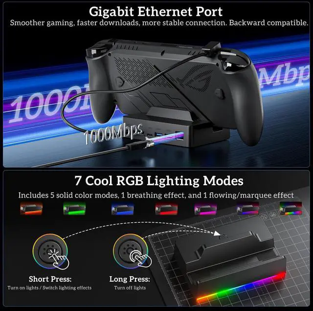 Vibrant RGB Lighting 7 Customizable Modes Customizable RGB lighting effects for ROG Ally X dock 7 modes including solid colors, breathing, flowing, and marquee. Short press to turn on/switch effects, long press to turn off adds stylish gaming ambiance to your for ROG Xbox Ally X setup.