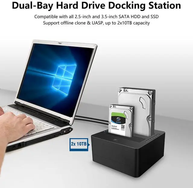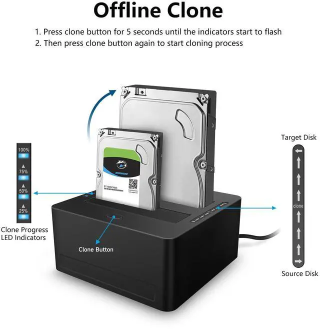 - The external hard drive dock supports offline clone, backup source disk to target disk automatically without connecting to computer.
