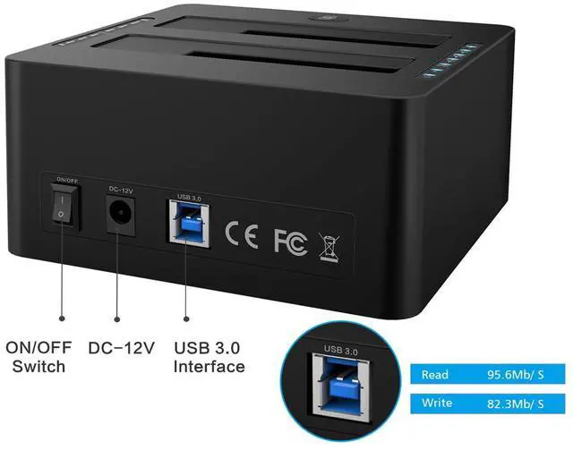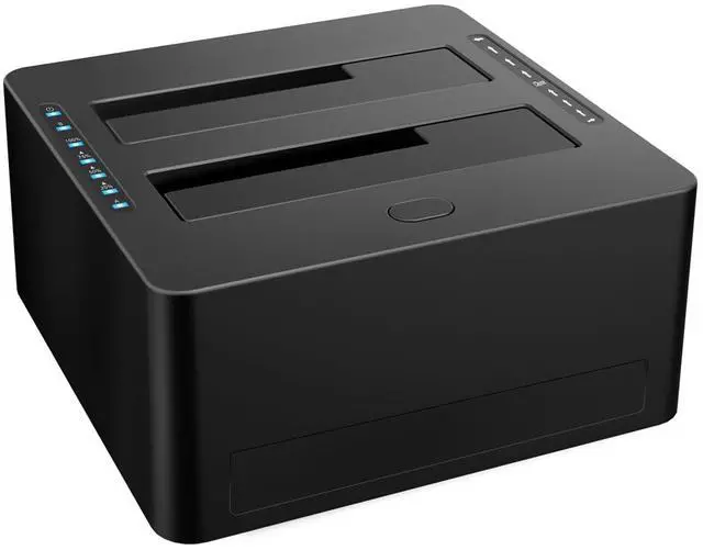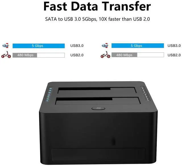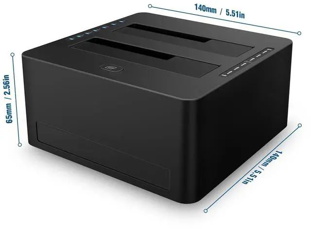 This dual bay hard drive duplicator supports all 2.5'' and 3.5'' SATA I/II/III HDD and SSD, up to 2*10TB capacity. Compatible with Windows, Mac OS and Linux. Play and play, no drivers needed.