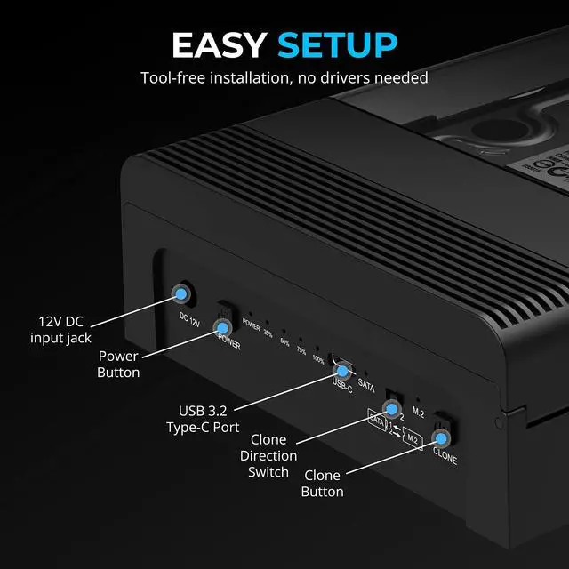 Clone one drive to another using built-in buttons—no software or PC needed.