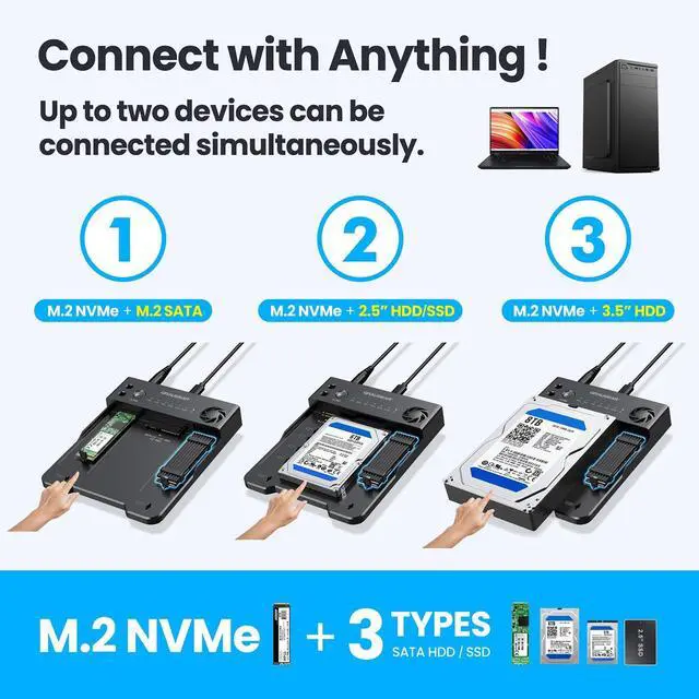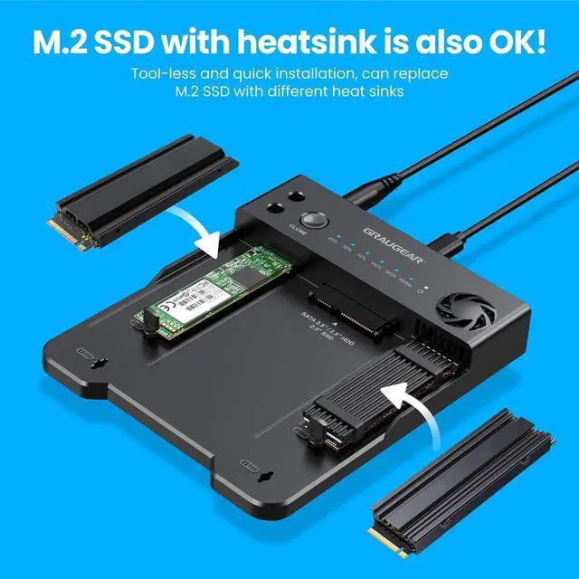 Clone between M.2 NVMe and SATA drives in both directions—no PC needed. With a built-in fan and aluminum heatsink, it keeps your SSDs cool and stable. Supports M.2 NVMe, M.2 SATA, and 2.5"/3.5" SATA SSD/HDD, with transfer speeds up to 10Gbps. Fast, efficient, and reliable for every storage task.