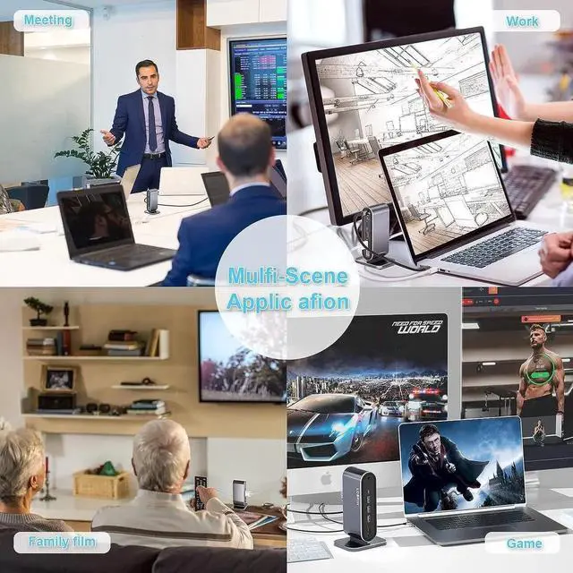 12 in 1 Laptop Docking Station: Perfectly combined the function of USB C Hub and docking station featuring type c port (100W PD charging), 4K HDMI ports,1*1920*1080@60Hz VGA port, 4*super speed USB 3.0 Ports(Up to 5Gbps), 100M/10M Ethernet RJ-45 port,USB-C Fast data transmission Port, SD/TF card reader, 3.5mm mic/audio port; Make Your Life More Intelligent; Specially designed for usb c interface equipment