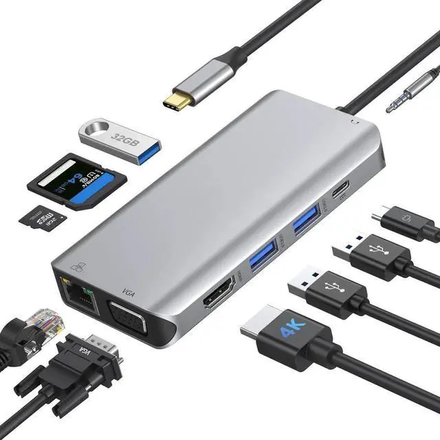 This usb c hub multiport adapter for Mac or other USB-C devices with the multiport USB-C hub featuring an Ethernet port, a USB C charging port with power delivery, a 4K/30Hz HDMI port, a SD card reader, a TF card reader, a 3.5mm Audio/mic 2-in-1 jack and a VGA port, 3 USB 3.0 Ports, allowing you to connect a keyboard, USB driver, external Disk or Wired headset to your USB-C devices. This usb c multiport hub applies to all laptops with type-c port.