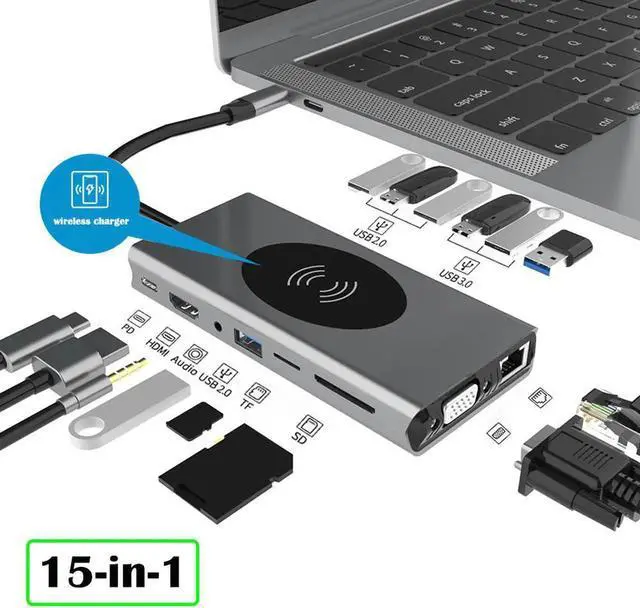15 in 1 USB-C Hub: Mac Adapter is easily fufill your daily use. It mainly extends your thunderbolt 3/Type C devices to 4K@30hz HDMI, VGA, network RJ45 interface, USB3.0/2.0 , SD/TF card reader, 3.5mm Audio jack and 87W PD Type-C charging port, Wireless Charging!