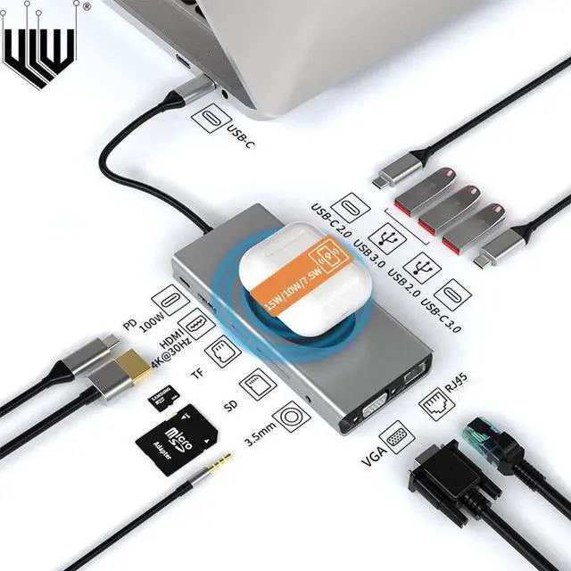 13 IN 1 Dual Monitor USB C Hub Multiport Docking Station Adapter with HDMI VGA Ethernet,3.5mm Audio,USB-C Data Port, Ethernet Dongle Laptop Hub 100W PD,Wireless Charging USB C Dock for MacBook/Dell