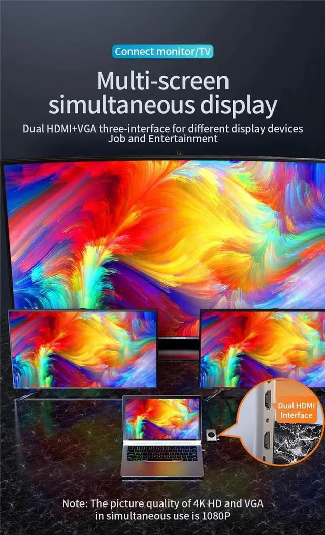 14-IN-1 USB C DOCKING STATION: This USB C multiport adapter has everything you need to expand your Type C computer or device. Cast your screen with HD HDMI and VGA ports, import photos with SD/MicroSD card readers, listen to audio, connect to your network with Ethernet, and plug in up to 5 USB 3.0 devices.