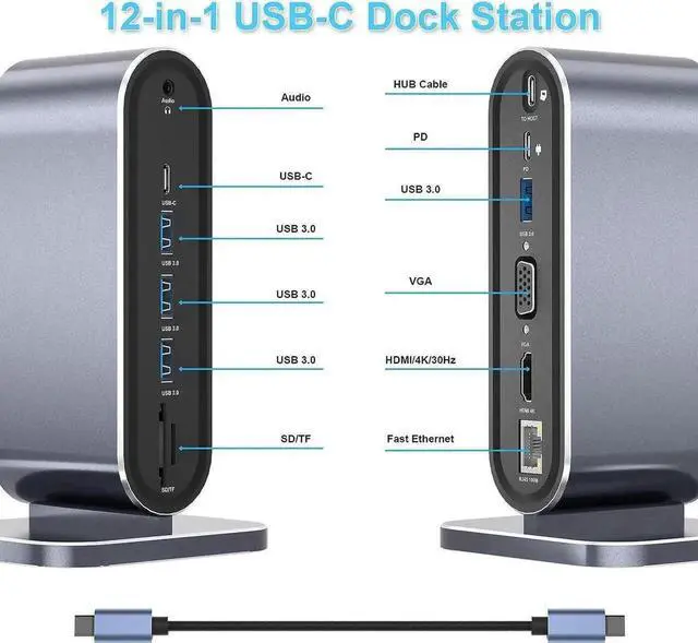 Multiple Functions - Docking Station has 1 x 4K@30Hz HDMI, 1 x 1080P@60Hz VGA, 1 x Fast Ethernet, 1 x 100W PD, 1 x USB-C, 1 x Audio, 1 x SD/TF, 4 x USB 3.0. All ports adopt the latest design, which can transmit information at a stable high speed