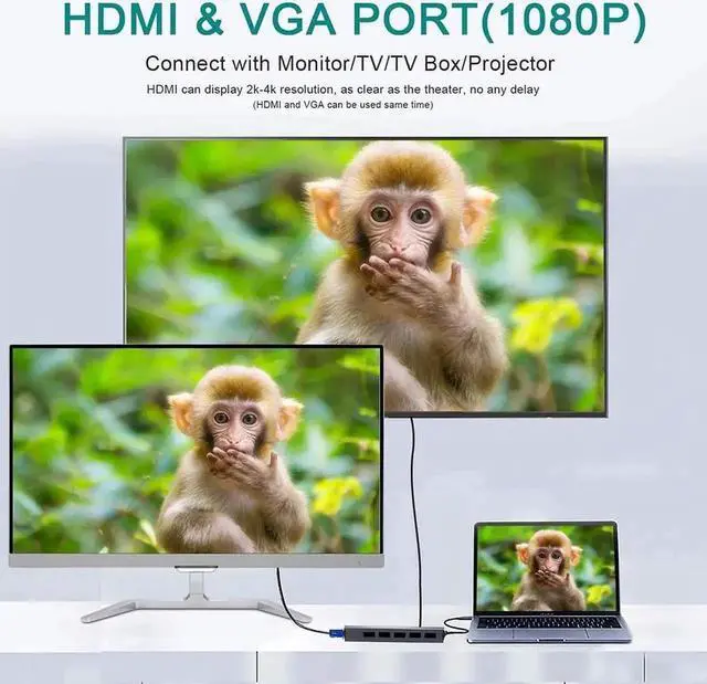 4K Video & Audio Output: Dual Monitor VGA, HDMI Port. 4k USB c hub able to extend your computer screen with to the tv, monitor or projector for video and audio transfer. Support 4k(3840x2160),2k(1920x1200),1080p(1920 x 1080) and 720p(1280 x 1024 ) Resolution.HDMI outputs crystal clear video streaming with incredible fluency.HDMI port to stream crisp, high-resolution videos on 4k monitor.