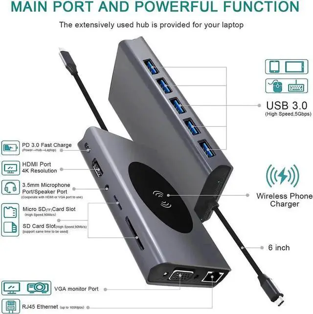 This USB Hub comes with built-in ports (Wireless mobile phone charger(10W/7.5W/5W) ,Ethernet RS45 , USB 3.0 x 5 ,4K HDMI Port , 1080P VGA , PD USB C Fast Charging Port , TF SD Reader Slot , 3.5mm Audio ) and you can connect everything you can think of, making it extremely handy.