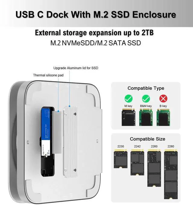Extended Storage with M.2 SSD Enclosure: This Mac Mini docking station is equipped with dual built-in Hard Drive enclosure, capable of running NVMe M.2 SSD, which space to easily increase memory storage without adding clutter to your workspace. The NVMe M.2 SSD enclosure support NVMe PCIe Gen3x1 (single channel) protoco. Connect the extra USB-C charging port for adequate power supply when use hard drivers in case of disconnects.