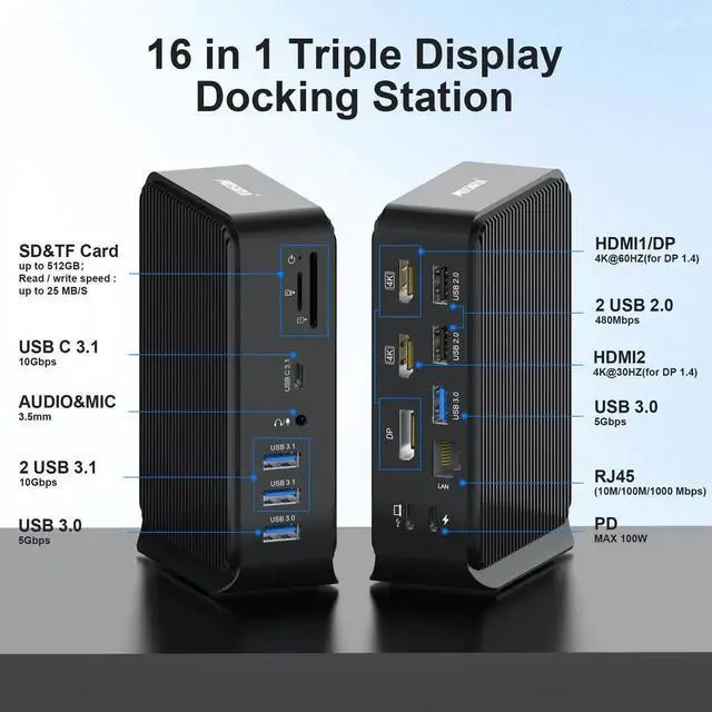 USB C Docking Station, 16-in-1 Triple Display Universal Laptop Docking Station with Dual 4K HDMI/DP, 6XUSB-A, USB-C (10Gbps), RJ45, Audio, 100W PD, SD/TF for Window, Mac OS