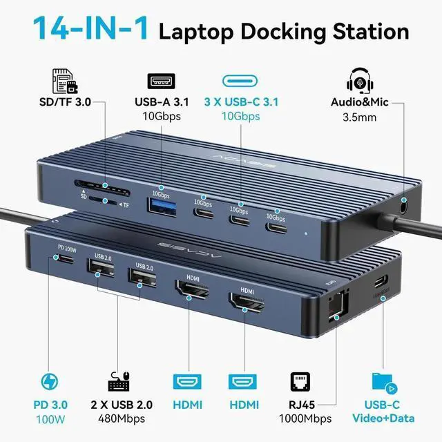 ACASIS USB C Hub with 4K Video Output USBC Splitter with 2*HDMI+4 * 10Gbps Data Transfer+Ethernet+SD/TF+Audio+PD100W Docking Station Dual Monitor for Laptop, Portable Monitor and More Type C Devices