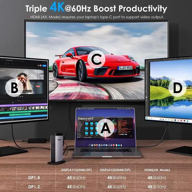• Break the limit for M1/M2/M3Unlock the full potential of your MacBook M1/M2/M3 or Windows laptop with the WAVLINK Displaylink Triple Display Docking Station. This USB C docking station allows you to effortlessly extend up to triple monitors with stunning 4K@60Hz resolution. Whether you need a triple 4K display setup or a mix of HDMI and DP connections, this docking station 3 monitors solution delivers exceptional visual clarity and productivity