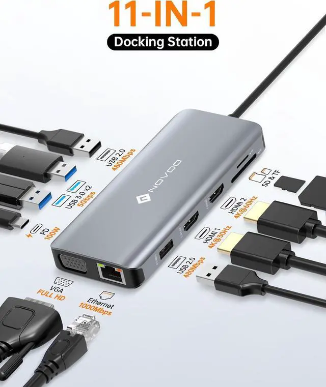 : Enhance your laptops capabilities with NOVOO 11 in 1 docking station that features 2 HDMI ports, VGA port, 1Gbps Ethernet port, 2 USB-A 2.0 ports, 2 USB-A 3.0 ports, 100W PD port, SD/TF card readers. This docking station dual monitor enables you to connect multiple devices and peripherals to your laptop with one simple USB-C cable. You can enjoy the convenience and efficiency of this docking station. NOT