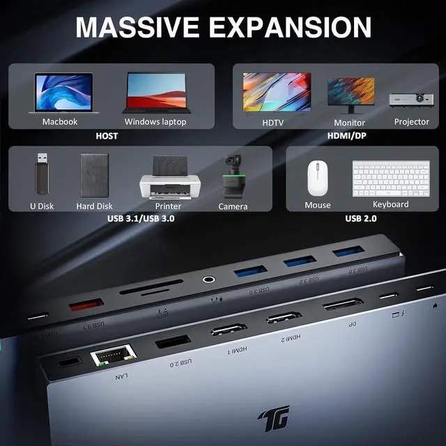 1. [15 in 1 Docking Station] Tiergrade 15 in 1 USB C Docking Station features 2 HDMI ports, 1 DisplayPort, 2 USB 3.1 ports(1 USB-A, 1 USB-C), 4 USB-A ports(3 USB 3.0, 1 USB 2.0 ), 100W PD charging, 1 Gigabit Ethernet port, SD&TF card slot, and 3.5 mm audio jack. This Dock lets you connect multiple devices through a laptop' s built-in USB-C port.