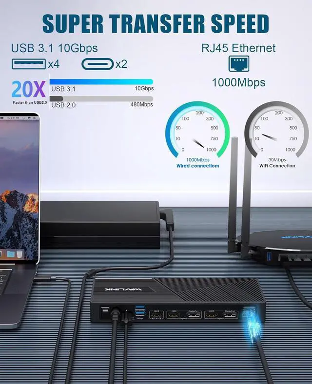 Fast 10Gbps Data Transfer: Equipped with 4x USB-A and 2x USB-C 3.1 ports (10Gbps), plus Gigabit Ethernet for ultra-fast data transfer and stable networking. Perfect for transferring large files and seamless online activities.