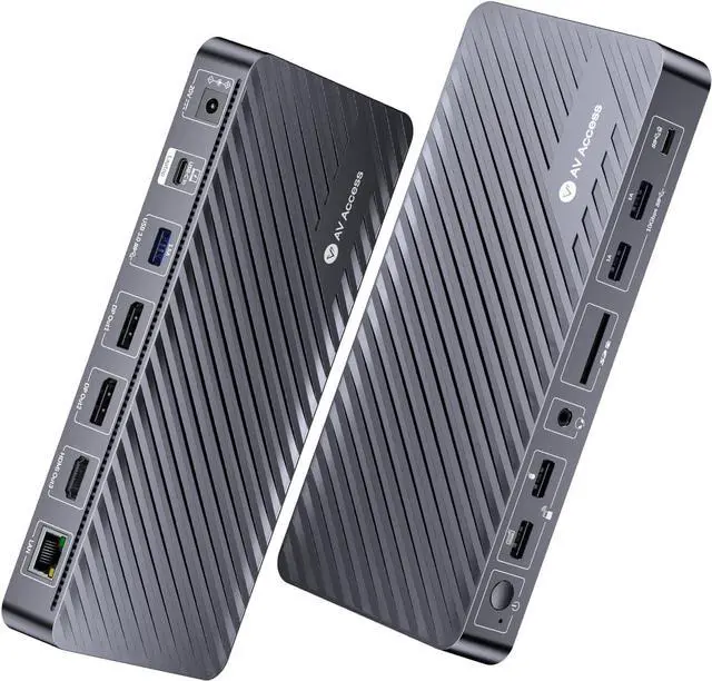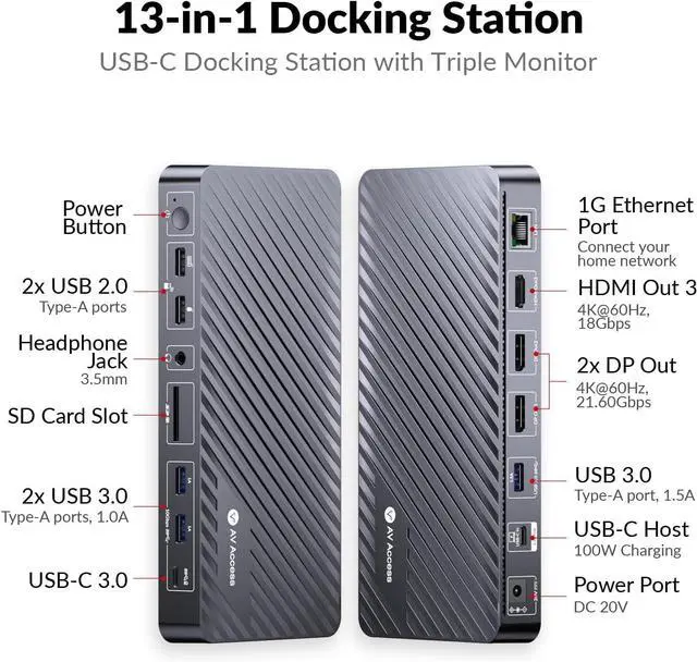 13-in-1 Triple Monitor Docking Station This all-in-one docking station for laptop expands connectivity with 13 ports: HDMI, DisplayPort, USB 3.0 / 2.0, USB-C (data), Gigabit Ethernet, SD card slot, and audio. Perfect for creating a high-performance setup with this laptop docking stations at home, office, or on the go.