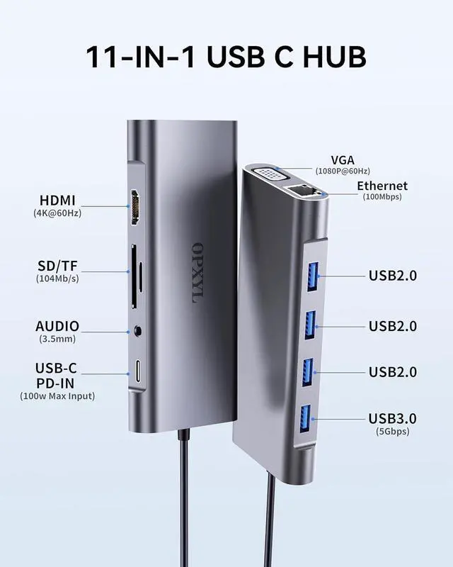 11-in-1 USB C Hub Multiport AdapterExpand your laptops USB-C port into 11 essential connections: 1×HDMI 4K@30Hz, 1×VGA 1080P, 1×USB 3.0 (5Gbps), 3×USB 2.0, 1×100W PD charging, 1×Ethernet (100Mbps), 1×SD, 1×TF, and 1× 3.5 mm audio jack. More ports than standard 7-in-1 or 9-in-1 hubsperfect for business, travel, and remote work.