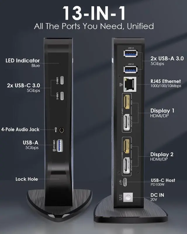13-in-1 Dock: Organize your desktop with this versatile USB-C hub. It offers 13 practical ports, including 3 5Gbps USB 3.0 ports and 2 USB-C ports for fast file transfers; a stable Gigabit Ethernet port for lag-free network connections; and a 3.5 mm audio/microphone port for your headphones. All your connections, in one integrated design.