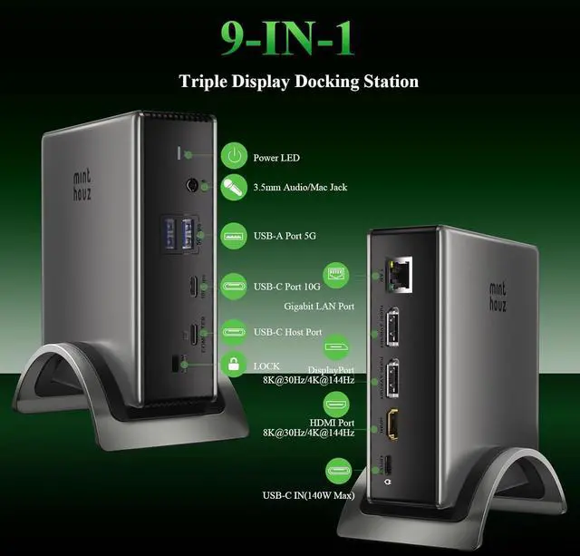 9-in-1 Docking Station with Versatile PortsThis 9-port USB C Dock delivers unmatched connectivity. with 2 DisplayPort and 1 HDMI port, supporting up to 8K@30Hz or 4K@144Hz on a single display. Laptop Dock Charge your laptop at 125W via the PD 3.1 port, transfer data quickly with 2 USB-A (5Gbps) and 1 USB-C (10Gbps) ports, and connect to wired networks with the Gigabit Ethernet port. A 3.5 mm audio/mic port ensures crystal-clear sound.