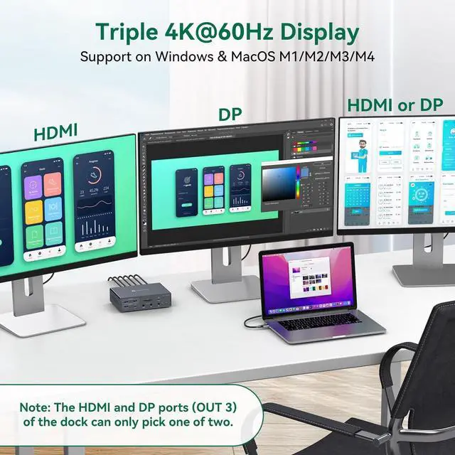 Triple 4K Extended Display: The usb c docking station dual hdmi supports up to three monitors simultaneously in both mirror and extended modes. With specific drivers installed per user manual, both Windows and macOS systems support MST and SST modes (ABCD, ABCC, ABBC, ABBB, etc. ).