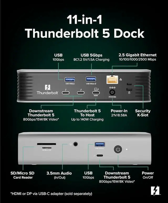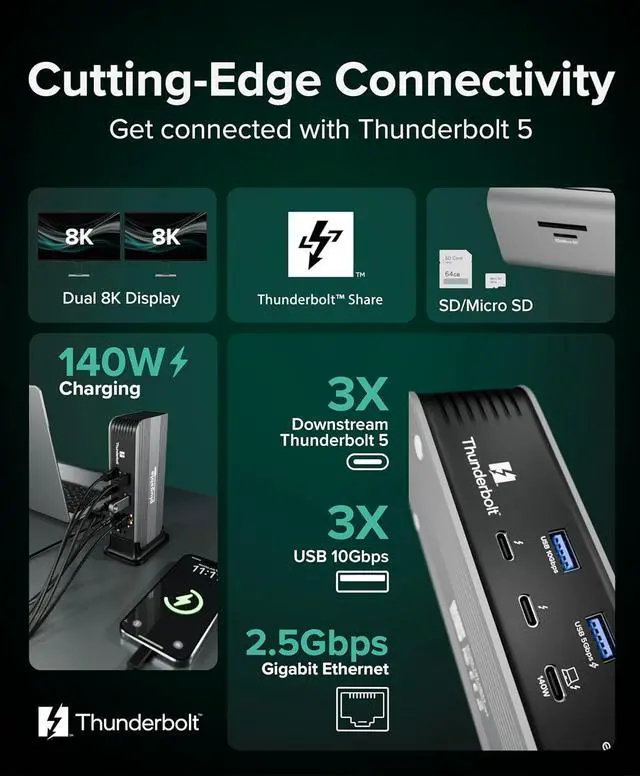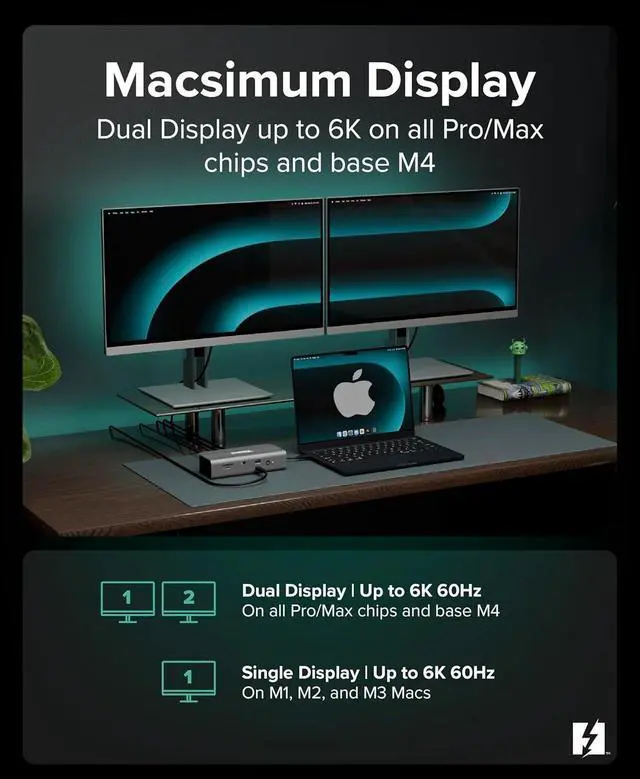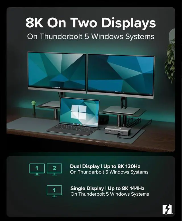 For Ultra-Smooth Visuals: This dock supports up to 2x 6K 60Hz displays on Mac or 2x 8K 120Hz or 2x 4K 144Hz on Windowsthanks to Thunderbolt 5s Bandwidth Boost, which prioritizes video performance for demanding creative workflows and high-refresh displays