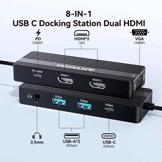 High-Speed 5Gbps Data Transfer: Experience lightning-fast data transfers with the ANYOYO USB-C Docking Station, featuring 5Gbps speeds on both the USB-C and USB-A ports. This rapid transfer rate allows you to quickly move large files, stream high-definition content, and connect multiple devices without lag. Whether youre transferring data or backing up important files, enjoy a smooth and efficient workflow that reduce wait time and enhance productivity.