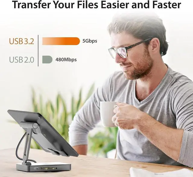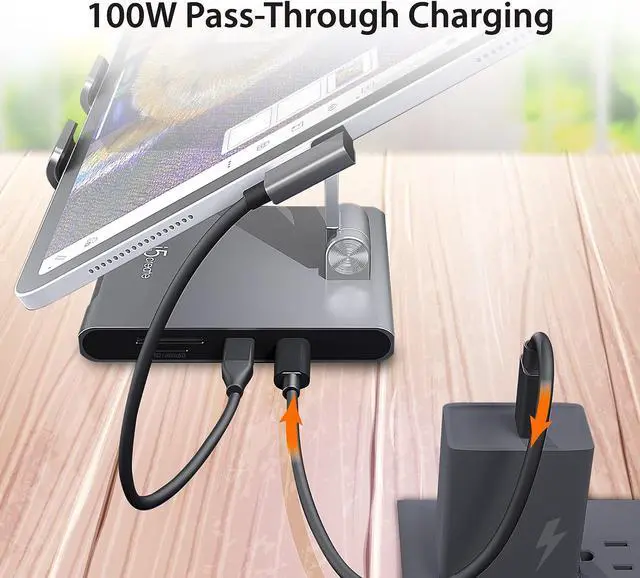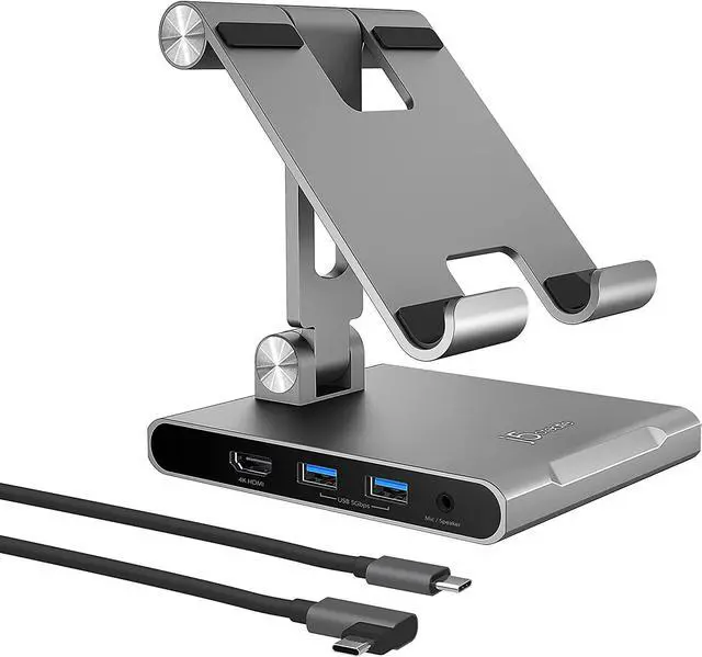 Wide Compatibility The integrated USB-C docking station is designed for any host device that has a full-featured USB C port, make sure your device USB-C port. When you use the stand to hold your tablet or heavy devices, please be careful to adjust to the optimal angle to make sure it won' t collapse.