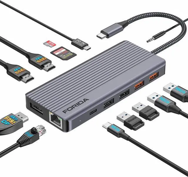 13 In 1 USB C Laptop Docking Station: - MacBook docking station designed with dual 4K@60HZ HDMI, 1 4K@60HZ display port, 100W PD, 2 USB A 3.2 10Gbps ports, 2 USB 2.0, 1 USB C 3.2 data port, RJ45 Gigabit 1000Mbps Ethernet, SD and TF card reader (parcel not include SD or TF card), 3.5 mm Audio, Our multiport adapter lightweight, good heat dissipation, portable and powerful, which meet all your connecting needs in a dock.