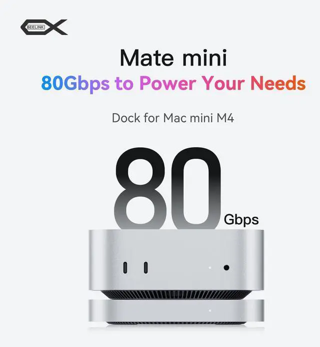 Expandable Storage: BEELINK EX Mate Mini-A features dual M. 2 2280 PCle slots, can be expanded to 16TB (8TB X 2), unleash the full potential of Mac Mini M4. The dock supports M. 2 2280 PCle 3.0 / 4.0 / 5.0 SSDs, Enjoy blazing 80Gbps transfer speeds of USB-C 5 Cable, easily handle large files, 4K editing, or backupswhile keeping your desk tidy (SSD not included)