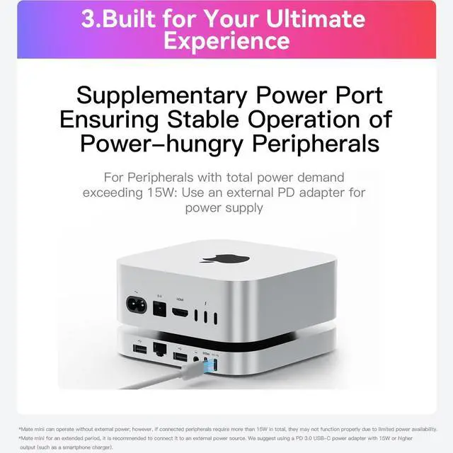 Note: All peripherals with a power below 15W can be powered directly by Mac mini, and the equipped Type-C port supports an external PD adapter to power peripherals with a power above 15W. We provide a one-year warranty, 24/7 one-to-one customer service, and lifetime technical support to give you peace of mind.