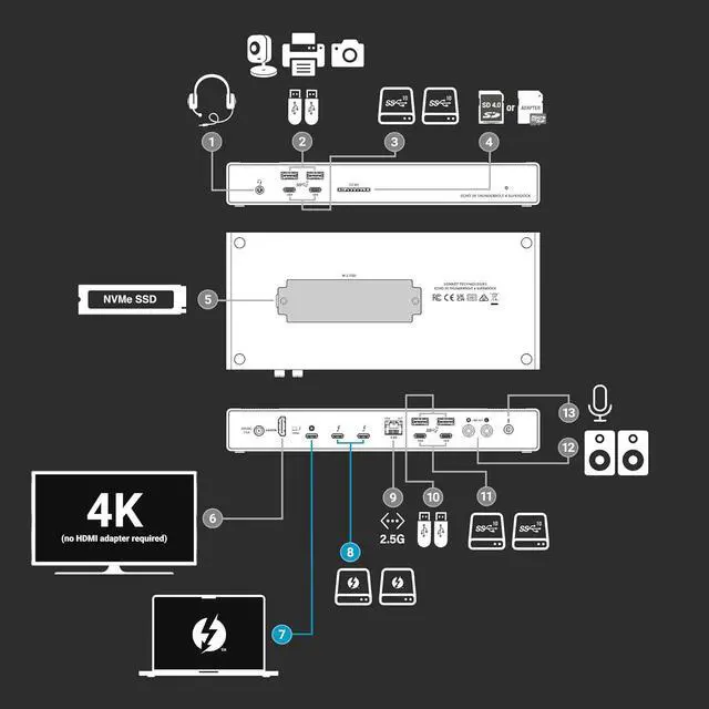 Twenty Interfaces: three Thunderbolt 4, four USB 3.2 Gen 2 Type A, and four USB 3.2 Gen 2 Type-C charging ports; HDMI port; RJ45 2.5 Gigabit Ethernet; 3.5 mm combo audio; 3.5 mm microphone; line-level R+L RCA audio out; SD 4.0 card slot; and M. 2 SSD slot.