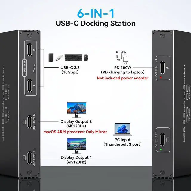 Dual Monitors: The 6-in-1 USB C hub multiport adapter supports Thunderbolt port laptops, Can transmit 4K 120Hz video signals to two USB-C displays. Equipped with 2 USB-C 3.2 data ports for connecting USB peripherals and supporting a 100W PD power to power laptops. With multiple functions in one, enjoy the convenience of high-quality performance.