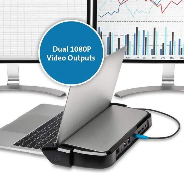 Provides 60W of laptop charging via PD 3.0; Dual DisplayPort++ ports support 2560x1440 @ 60Hz to a single monitor and 1920x1080 @ 60Hz to dual monitors; 2 USB-A Gen 1 ports and 2 USB-A Gen 2 ports; mic/headphone/speaker combo jack; gigabit ethernet port