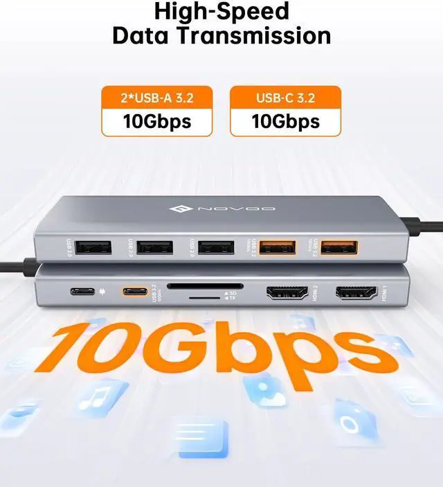 12-in-1 Laptop Docking Stationlug and play hub expands your laptop with 2×HDMI (4K@60Hz + 4K@30Hz), VGA (1080P@60Hz), USB-C 3.2 (10Gbps), 2×USB-A 3.2 (10Gbps), 3×USB 2.0, SD/TF 3.0 card reader (170MB/s), and 100W PD charging port.
