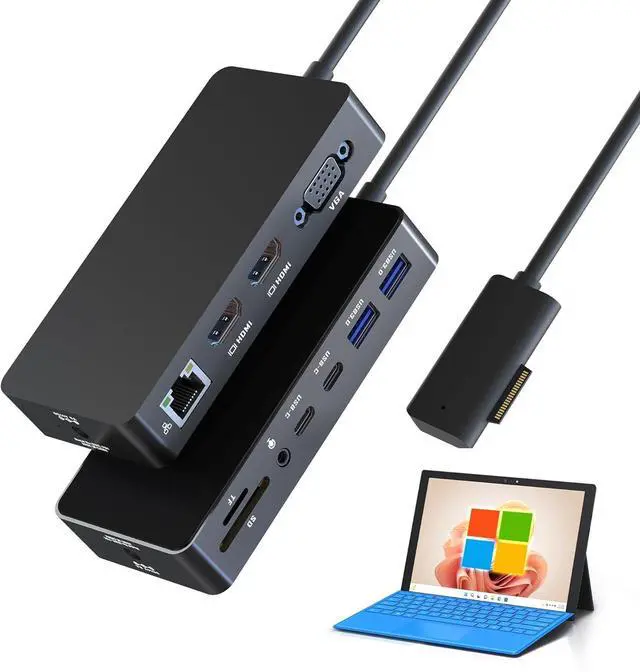 Triple Display Domination-Expand Your Productivity Canvas: Unlock 3X screen real estate with our signature 2x HDMI + 1x VGA configuration the ultimate Surface Pro dock for multitaskers. Supports crystal-clear 4K@30Hz (HDMI) and 1080p@60Hz (VGA).