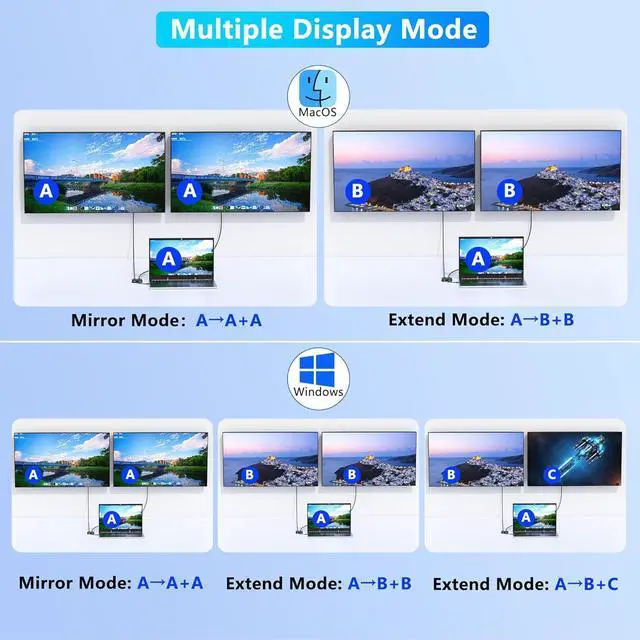 Mirror and Extend Mode For Mac OS, this dual monitor adapter only has mirror modeA-AAA-BB, and cannot extend two different screens due to Mac OS limitation. For Windows OS, it supports dual hdmi to display different screensA-AAA-BBA-BC). If the monitor of your laptop is not enough space to complete the work, then this dual hdmi adapter will be a good choice!