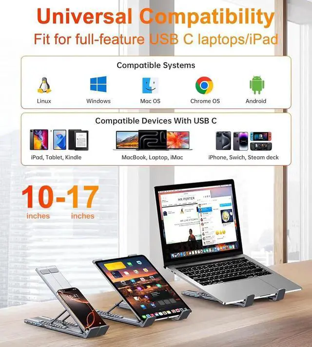 USB C Docking Station Stand: Our lightweight and foldable laptop stand safely supports laptops from 10-17 inches and features 8 integrated ports for all your connectivity needs. USB C docking station for USB C macOS and Windows laptops is equipped with 4K HDMI, 2*USB 3.0(up to 5Gbps), 1*USB C PD 3.0 port, and 1*USB-C Data, 1*SD, 1*TF. The USB C dock stands perfectly combine the function of a USB C dock and a laptop stand, making it the best choice for your USB C laptop with more features and possibilities.