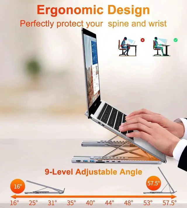 Ergonomic Design Laptop Stand: The Upgraded laptop docking station stand features 9-level to adjust the height, allowing you to choose the perfect angle for your posture and body type. It helps you to release the tension of your neck pain, back pain, and eye fatigue making you work comfortably and keep healthy. The triangle support design makes the laptop stand more stable. The non-slip silicone pad on the stand can fix your laptop in place and protect your device from scratches and slipping. The forward-tilt angle and open design provide increased ventilation and more airflow to cool your laptop while operating other than lying flat on the table.