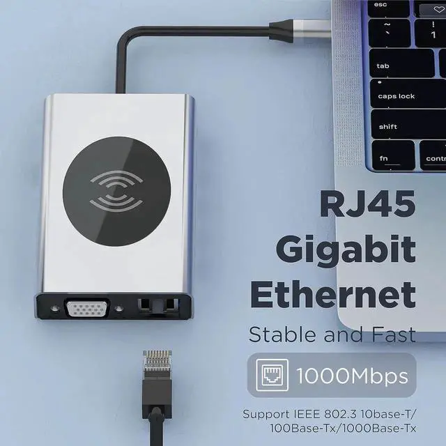 USB C HUB 13 IN 1 with Wireless Charging: This USB-C adapter with wireless charging function easily expands the Type-C/Thunderbolt 3 ports of USB-C laptops to 12 ports plus wireless charging: 4K HDMI, VGA, 1000M Ethernet LAN, 2 × USB 3.0, USB 2.0, USB C 3.0 and 2.0, 100W PD, SD/TF card reader and 3.5mm audio. Lightweight, portable, powerful, the AUBEAMTO docking station meets all your home and office needs. Compatible with Dell XPS 13/15, Surface, Lenovo, HP, and more, this versatile hub ensures seamless connectivity and high-speed data transfer. Great companion for Macbook Pro and other Type-C devices.