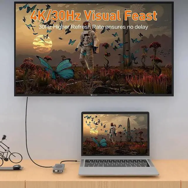 [HD 4K Output]: This docking station has a single HDMI output (4K 3840 x 2160 @ 30Hz) and a VGA output (1920 x 1080 @ 60Hz). With this USB C adapter you can mirror your PC/tablet/smartphone to your TV, monitor or projector. Using HDMI and VGA at the same time will only show the same image. Reminder: Power the HUB from the PD port while using HDMI or VGA for perfect performance.