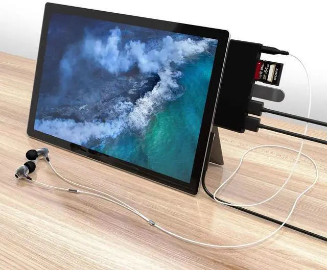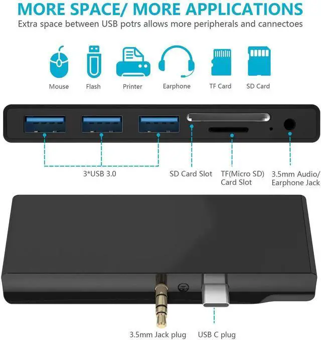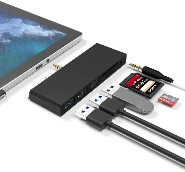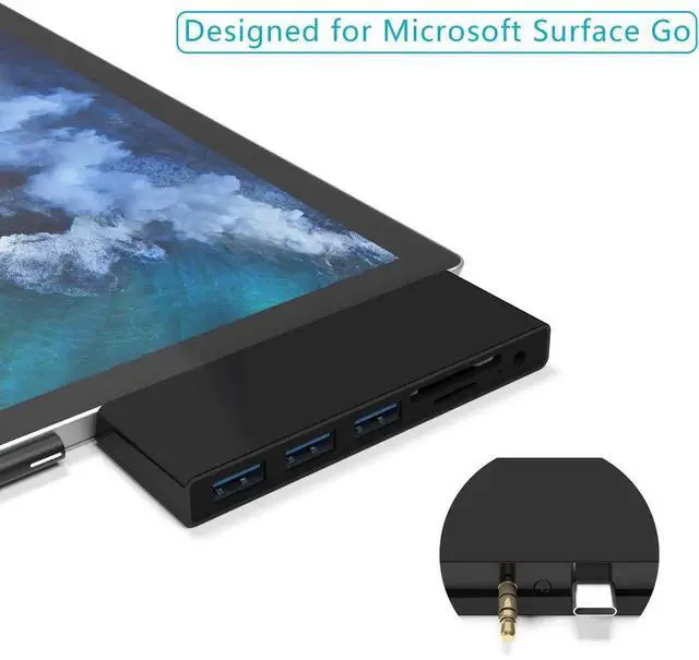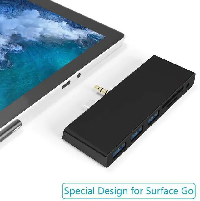 ??Multifunctional Station Surface Go Adapter?This plug-and-play USB C Hub includes 3 USB 3.0 ports, SD/TF Card Reader, 3.5 mm Audio Headphone Jack in an extremely compact and sleek design. All ports can be used on the hub simultaneous. Specially designed for Microsoft