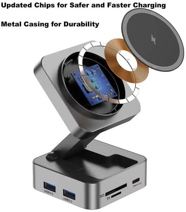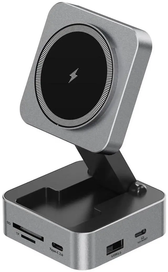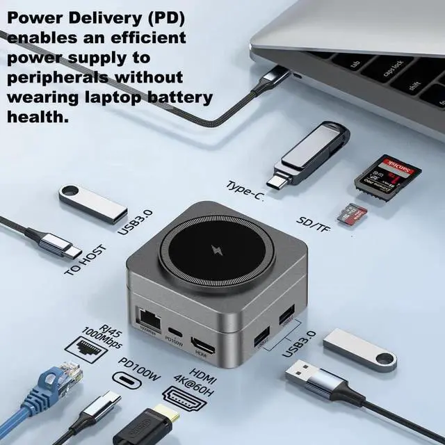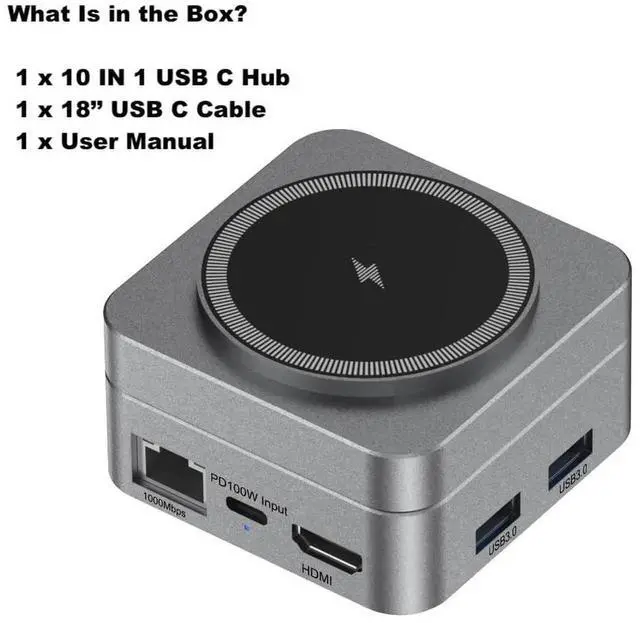 Elevate your workspace and travel experience with this 10-in-1 Portable USB-C Docking Station, designed to provide seamless connectivity and convenience on the go. Featuring a Wireless Charger, you can easily charge your iPhone or other Qi-enabled devices without the need for cables. This compact yet powerful multiport hub offers a variety of essential connections, including 4K HDMI output, USB-A, USB-C, Ethernet, and SD/TF card slots, enabling you to expand your devices capabilities effortlessly. Whether you're connecting to a projector for presentations, transferring data, or using multiple peripherals, this docking station has you covered. Constructed from premium aluminum alloy, it offers exceptional durability, making it the perfect companion for travel or any on-the-go setup. Its lightweight and portable design ensure that you can carry it easily in your bag or briefcase without taking up much space.