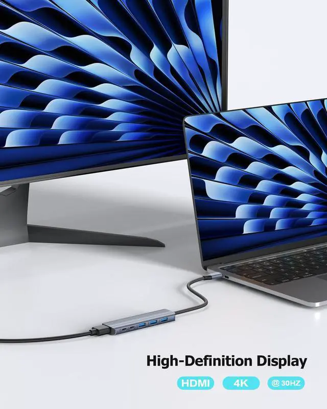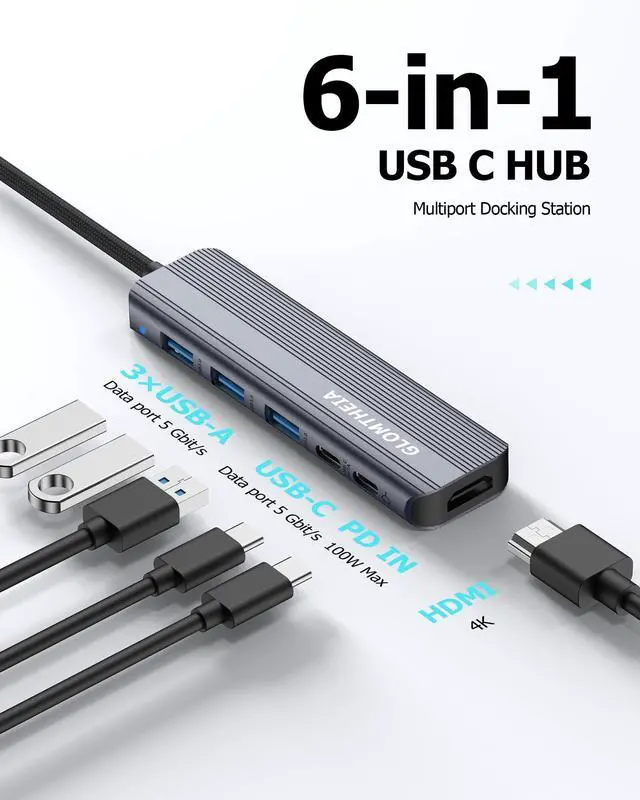 6-IN-1 CONNECTIVITY: Equipped with a 5 Gbps USB-C data port, three 5 Gbps USB-A ports, a 4K@30Hz HDMI port, and a 100W PD-IN port.