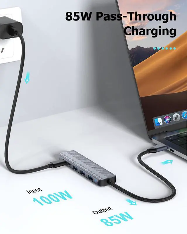 PASS-THROUGH CHARGING: Supports up to 85W pass-through charging so you can power up your laptop while you use the hub.