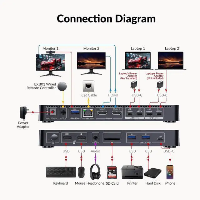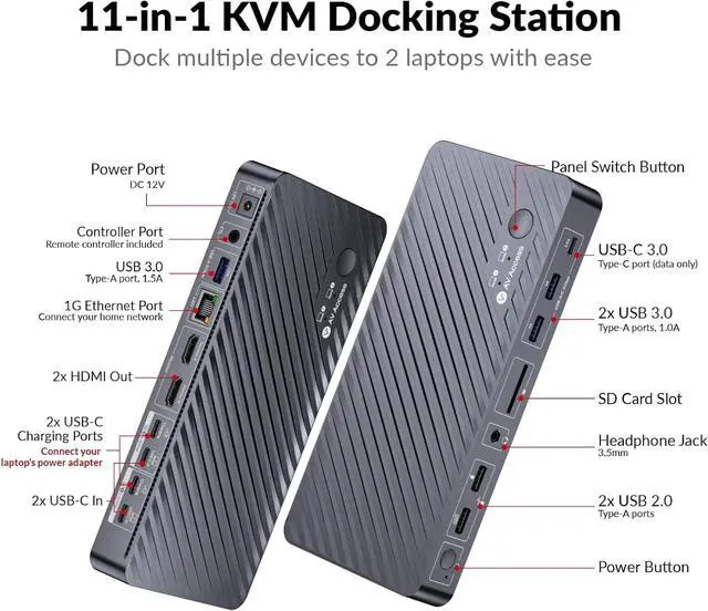 Powerful 11-in-1 Docking Station With this KVM switch docking station, you can expand your workspace with a variety of shared ports between 2 laptops, including 3x USB 3.0, 2x USB 2.0, 1x USB-C, 1x 1G Ethernet, 1x 3.5 mm headset, 1x SD card slot and 2x HDMI output. Build a powerful workstation at home with ease.