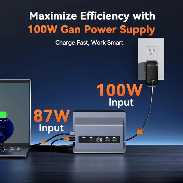 100W Power Supply Included-The laptop docking station supports PD 3.0 fast charging, with 87W continuous output to keep your laptop running efficiently even when multiple peripherals are connected. Used to charge Windows/ChromeOS laptops reliably under heavy use, it eliminates the hassle of multiple chargers and ensures your device stays powered all day.