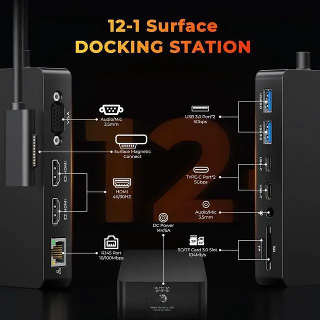 12 IN 1 Versatile Surface Dock for Enhanced ProductivityEquipped with Surface Connection technology, this Surface docking station offers a range of connectivity options for all your peripherals with 2x HDMI*4K@30Hz, VGA*1080P@60Hz, 100Mbps RJ45 Ethernet port, 2x USB C data port, 2x USB A 3.0 Ports, SD/TF card slot, 3.5 mm Headphone Jack Port, DC Power adapter, Surface dock With simple plug and play connectivity. professional setup on your office desk or in a conference room with just one MS Surface Dock.