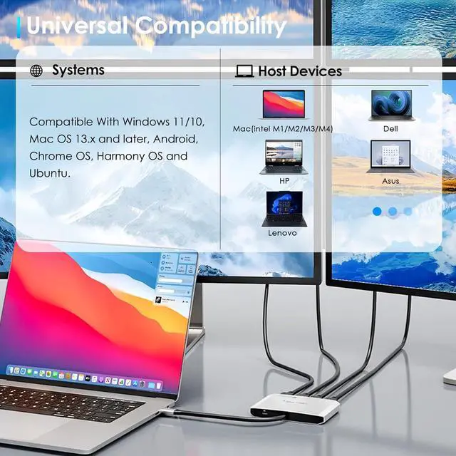 Strong SMI770 Chip - Thanks to this chip, laptops with macOS can extend 4 different displays, which greatly unleashes the productivity of M1/M2/M3/M4. Also It compatible with a wide range of operating systems, including Windows 11/10, Mac OS 13. x and later, USB-C upstream is compatible with Thunderbolt 4/3 and full-functional USB4/ 3.2 / 3.1 / 3.0 / 2.0 Type-C hosts