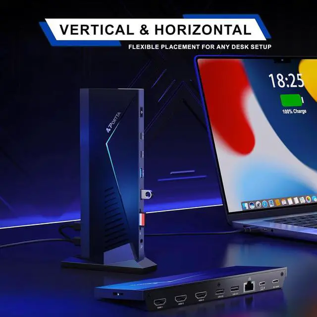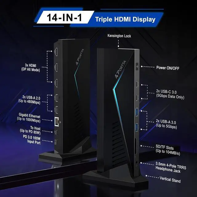 14-in-1 USB-C Docking Station Expand your laptop with 3x HDMI, 4x USB-A, 2x USB-C (Data), Gigabit Ethernet, SD/TF card reader, 100W PD charging, and a 3.5 mm audio jackall in one compact dock.